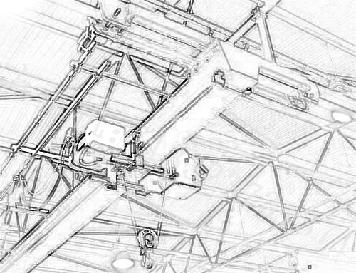 电动葫芦大多安装在U型轨道上,针对这个特点,把钢索布置在轨道中间,工字钢上部。钢索采用钢丝绳或圆钢,端部用花篮螺栓紧固。滑动环为两圆环相扣,有一定余量,用来避免钢索刮卡。转向环为两圆环用螺栓相连,可自由转动。把一个转向环一端套在钢索上,留好电动机引线后把橡套线固定在转向环下端。把多个滑动环一端穿到钢索上,再把橡套线分段固定在滑动环下端。前端接电动机,可自由移动。后端接在电源上。在电动机的牵引下,以转向环为中心,牵引钢索作直线或圆周运动。